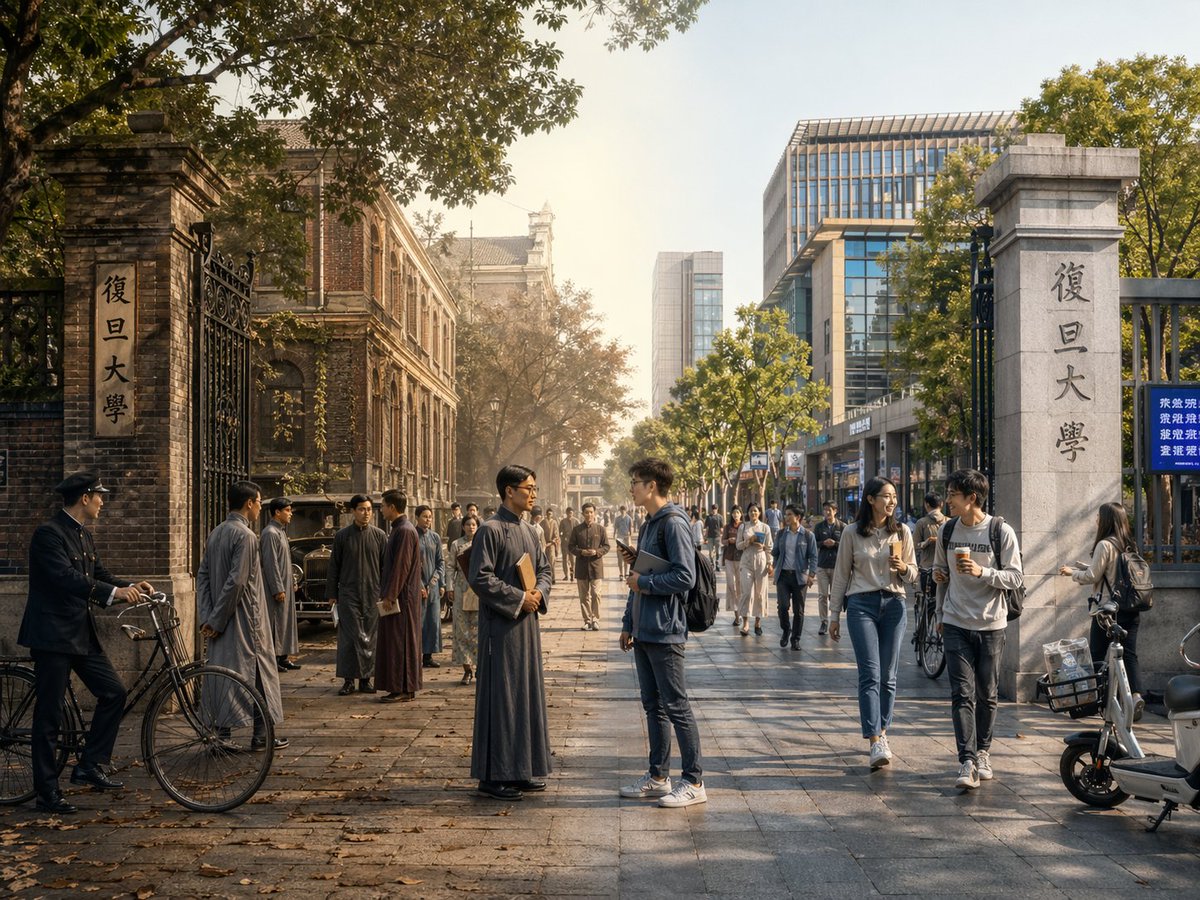 In the center: the two eras merge and overlap organically, without a hard dividing line. Elements from {Era_A} and {Era_B} visually interact: people from different times look at each other, walk through each other’s space, or seem surprised by the other era’s technology and objects. Architecture and environment smoothly morph from old to new (for example, stone gates turning into modern campus gates, classical concert hall décor fading into a futuristic stage, old street shops transforming into neon-lit storefronts).