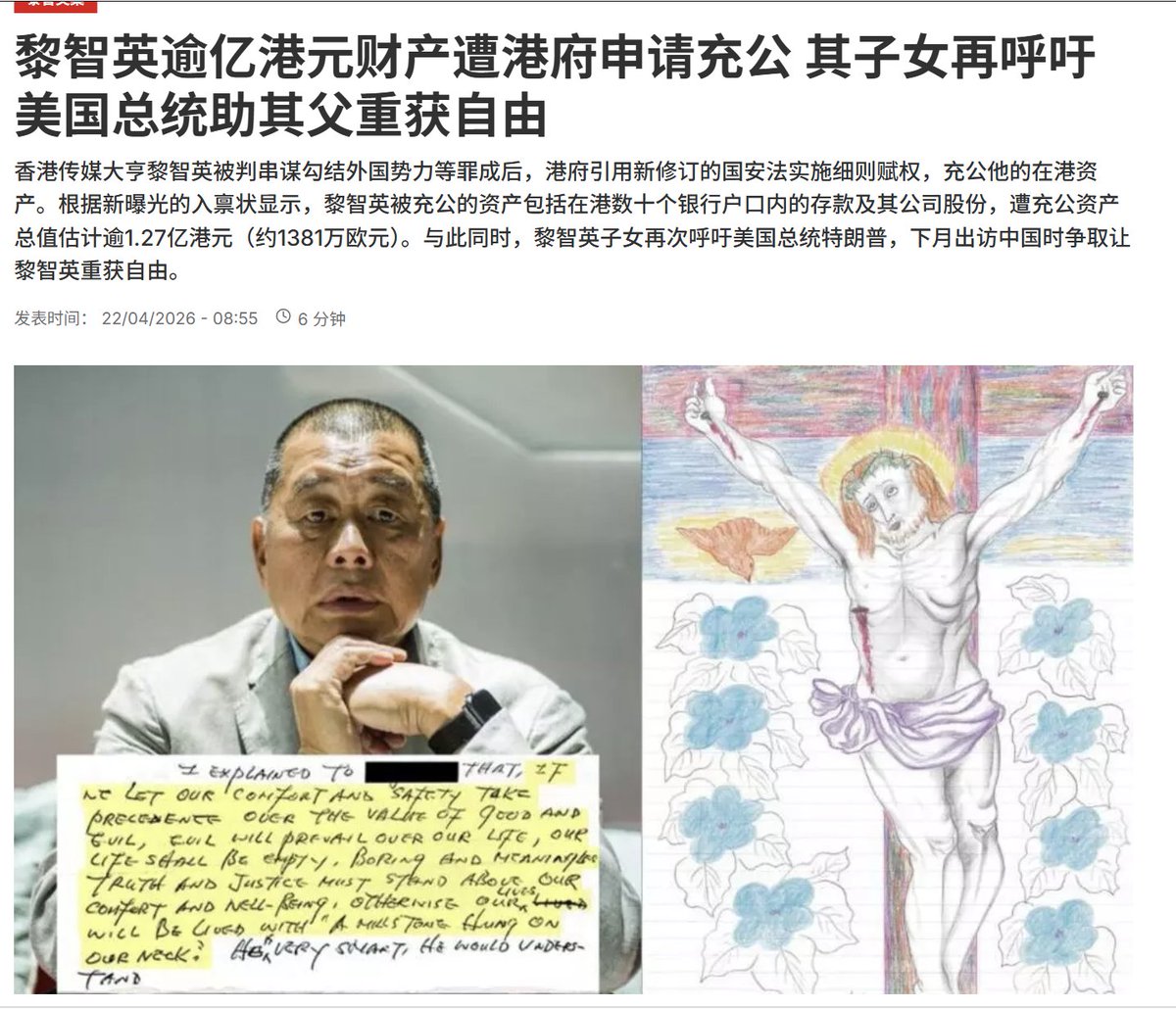 香港政府正在申请黎智英财产充公 。 香港传媒大亨黎智英被判串谋勾结外国势力等罪成后,港府引用新修订的国安法实施细则赋权,充公他的在港资产。根据新曝光的入禀状显示,黎智英被充公的资产包括在港数十个银行户口内的存款及其公司股份,遭充公资产总值估计逾1.27亿港元(约1381万欧元)。与此同时,黎智英子女再次呼吁美国总统特朗普,下月出访中国时争取让黎智英重获自由。