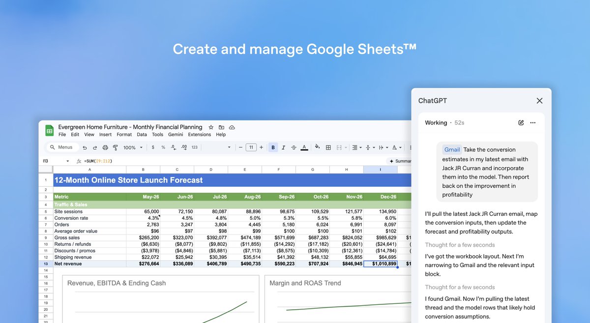 用法很直观:打开一个空白表格,用自然语言告诉 ChatGPT 你想做什么,它会帮你建表、填数据、写公式、做分析。官方举的例子从婚礼策划到咖啡店商业计划再到财务规划,覆盖面很广,核心卖点就是"不用学公式,说人话就行"。