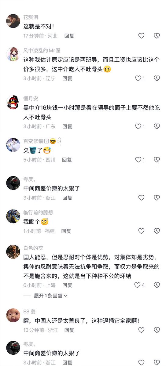4月22日,在一个广州兼职群里,劳务中介发消息称,当地一家工厂招聘一名女保安,时薪16元/小时,不满工期按14元/小时发放。上班时间为早上10点——第二天凌晨,每天可以休息50分钟。 一名男子在群里说:“真的牛逼,这能把人活活上死吧” 随后该男子被中介踢出群聊。事后中介给他发消息说,你不找工作就不要在群里乱说话,这种活你不干有的是大把人干! 网友们表示,中间商赚差价太狠了,中介吃人不吐骨头。