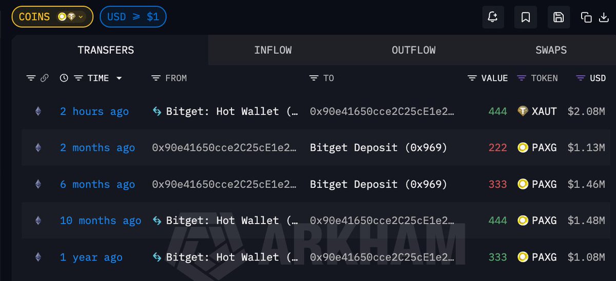 通过 $PAXG 波段获利 106 万美元的地址,时隔 10 个月再次囤积数字黄金🙌 地址 0x90e…cBe54 2 小时前从 #Bitget 提出 444 枚 $XAUT ,价值 208 万美元;此前他曾以均价 $3301 囤积 777 枚 PAXG,随后在 $4655 疑似抛售 555 枚并获利 75.1 万美元,剩余 222 枚仍浮盈 30.7 万美元 钱包地址 https://t.co/UJhUZDxs3p #Bitget VIP 费率更低,福利更狠!买美股秒级入场
