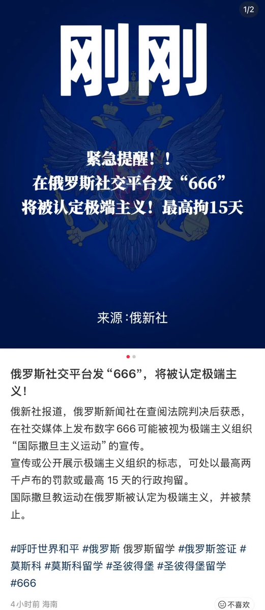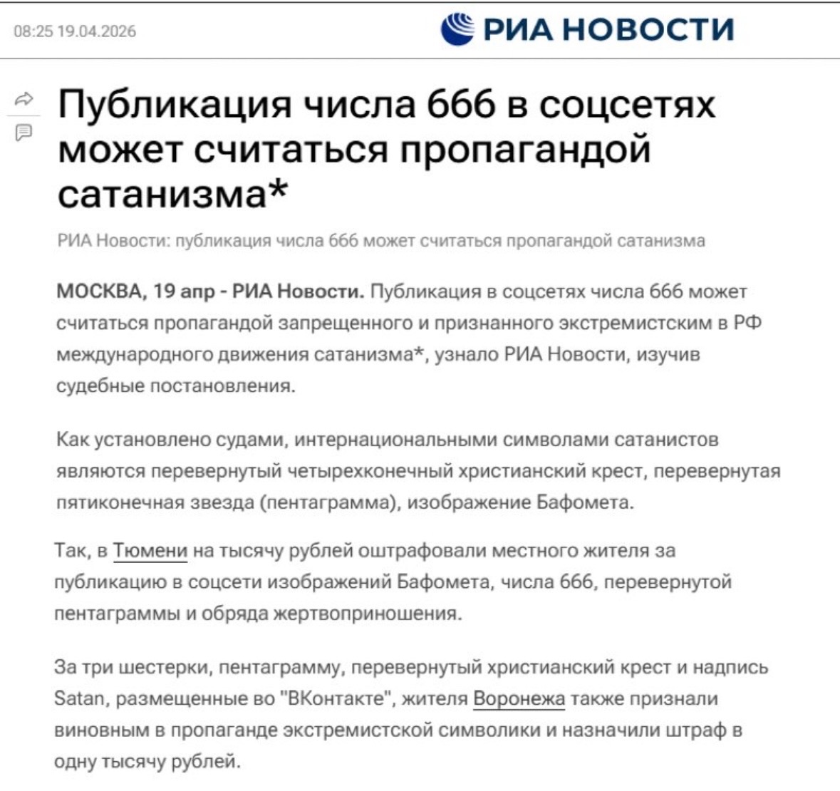 俄罗斯社交平台发“666”,将被认定极端主义 俄新社报道,俄罗斯新闻社在查阅法院判决后获悉,在社交媒体上发布数字666可能被视为极端主义组织“国际撒旦主义运动”的宣传。 宣传或公开展示极端主义组织的标志,可处以最高两千卢布的罚款或最高 15 天的行政拘留。 国际撒旦教运动在俄罗斯被认定为极端主义,并被禁止。