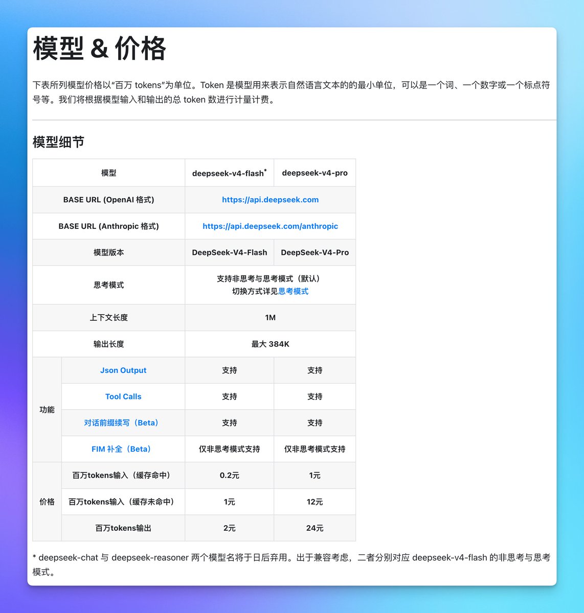 我去,DeepSeek V4 终于来了! 有两个型号,一个 Flash,一个 Pro。 新版本的功能支持非常全面: 支持 JSON 输出 支持工具调用 支持对话前缀续写 支持 FIM 补全 价格方面: Flash 型号:每百万输入/输出的价格分别是 ¥0.2 和 ¥1 Pro 型号:每百万输入/输出的价格分别是 ¥1 和 ¥12 另外,100 万上下文的价格输出会翻一倍。