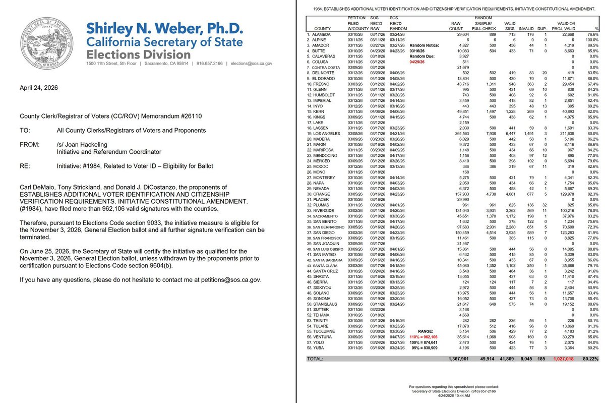 加州州务卿办公室今天确认: 支持者提交的130多万签名中,有超过96.2万有效签名,远超所需门槛!