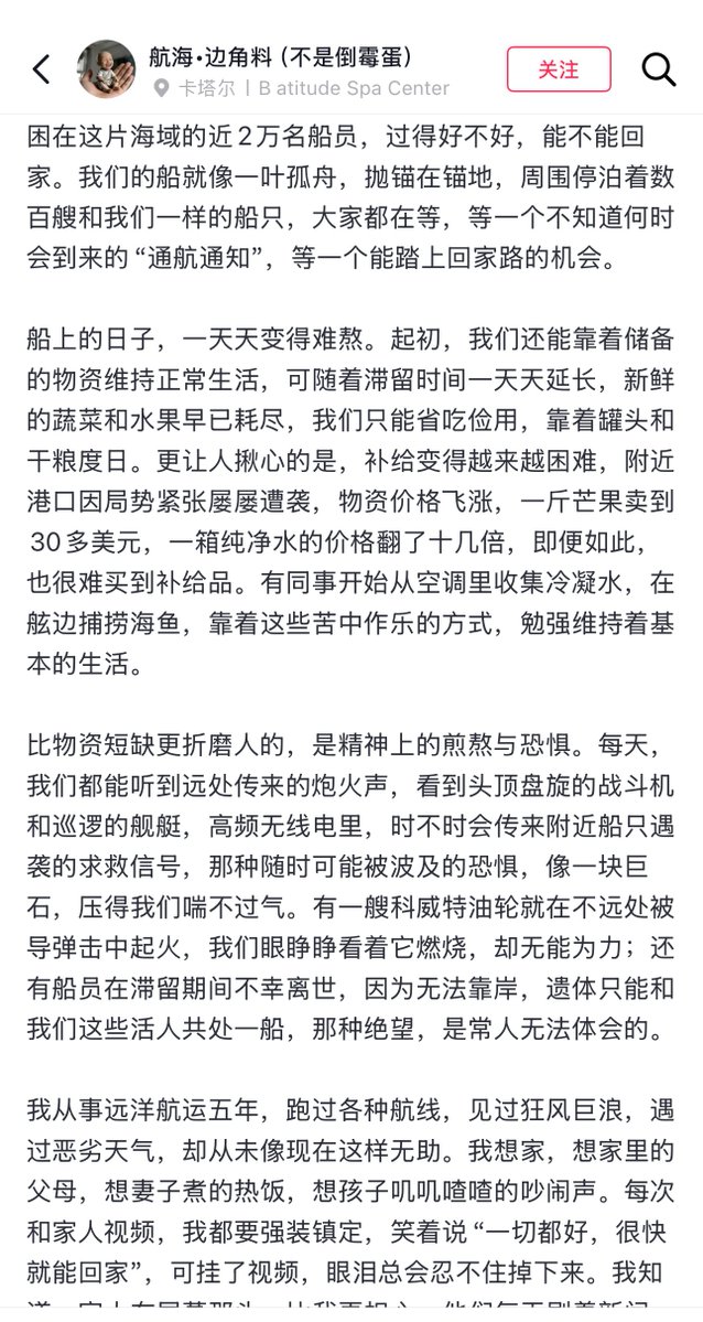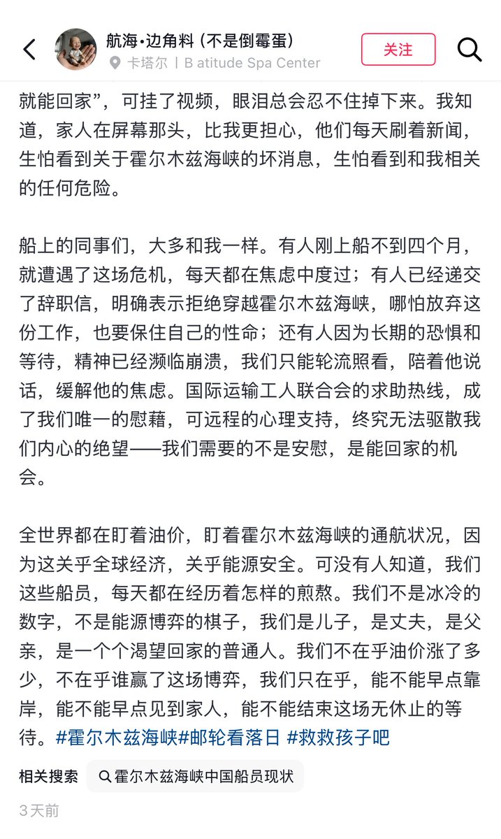 这名船员最后说:“全世界都在盯着油价,盯着霍尔木兹海峡的通航状况,因为这关乎全球经济,关乎能源安全。可没有人知道,我们这些船员,每天都在经历着怎样的煎熬。我们不是冰冷的数字,不是能源博弈的棋子,我们是儿子,是丈夫,是父亲,是