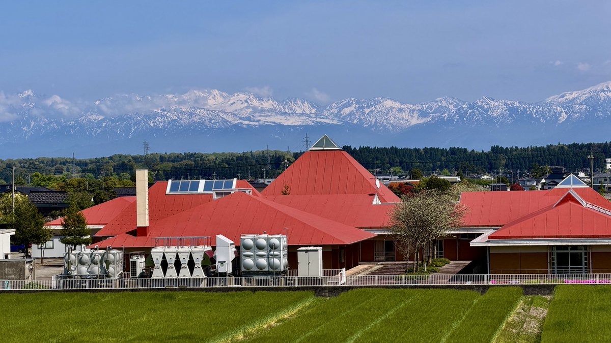 日落前騎到雪山腳下。日本的阿爾比斯,山下麥田青青,山上白雪皚皚。