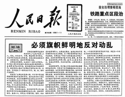 89年4月26日人民日报发表曾建徽起草的社论《旗帜鲜明地反对动乱》,将学运定性为动乱。激四二六社论杀气腾腾,发出了血腥镇压的信号。从此,学生的要求变为两点:1、摘掉动乱的帽子;2、平等对话。#图说八九六四