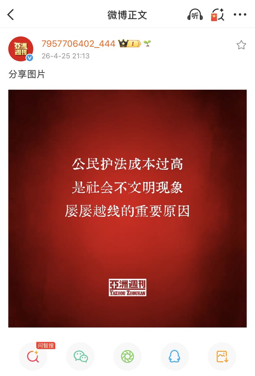 《亚洲周刊》一针见血评论:“公民护法成本过高,是社会不文明现象屡屡越线的重要原因”