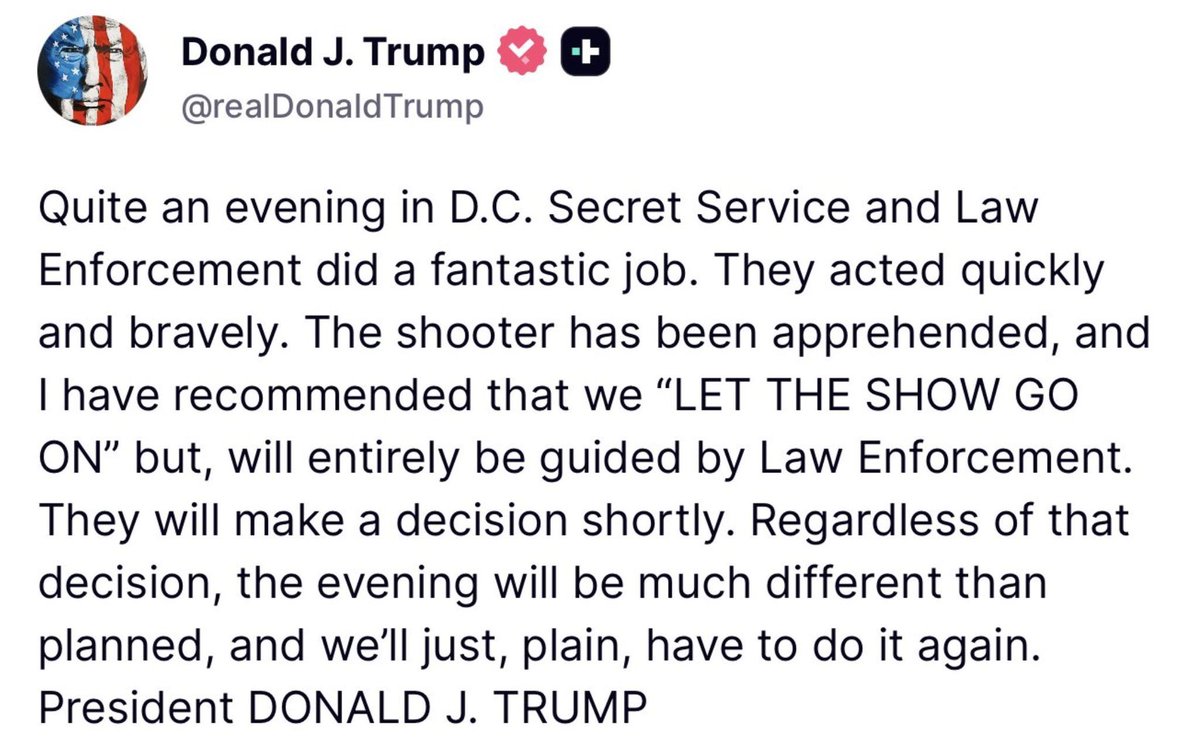 这是一个极不寻常的夜晚。在华盛顿特区,特勤局和执法部门表现非常出色,他们行动迅速且勇敢。枪手已被抓获。我也建议“活动继续进行”,但整个安排将完全由执法部门来决定。他们很快会作出判断。无论结果如何,今晚都将与原计划不同,我们很可能需要改日再举行。