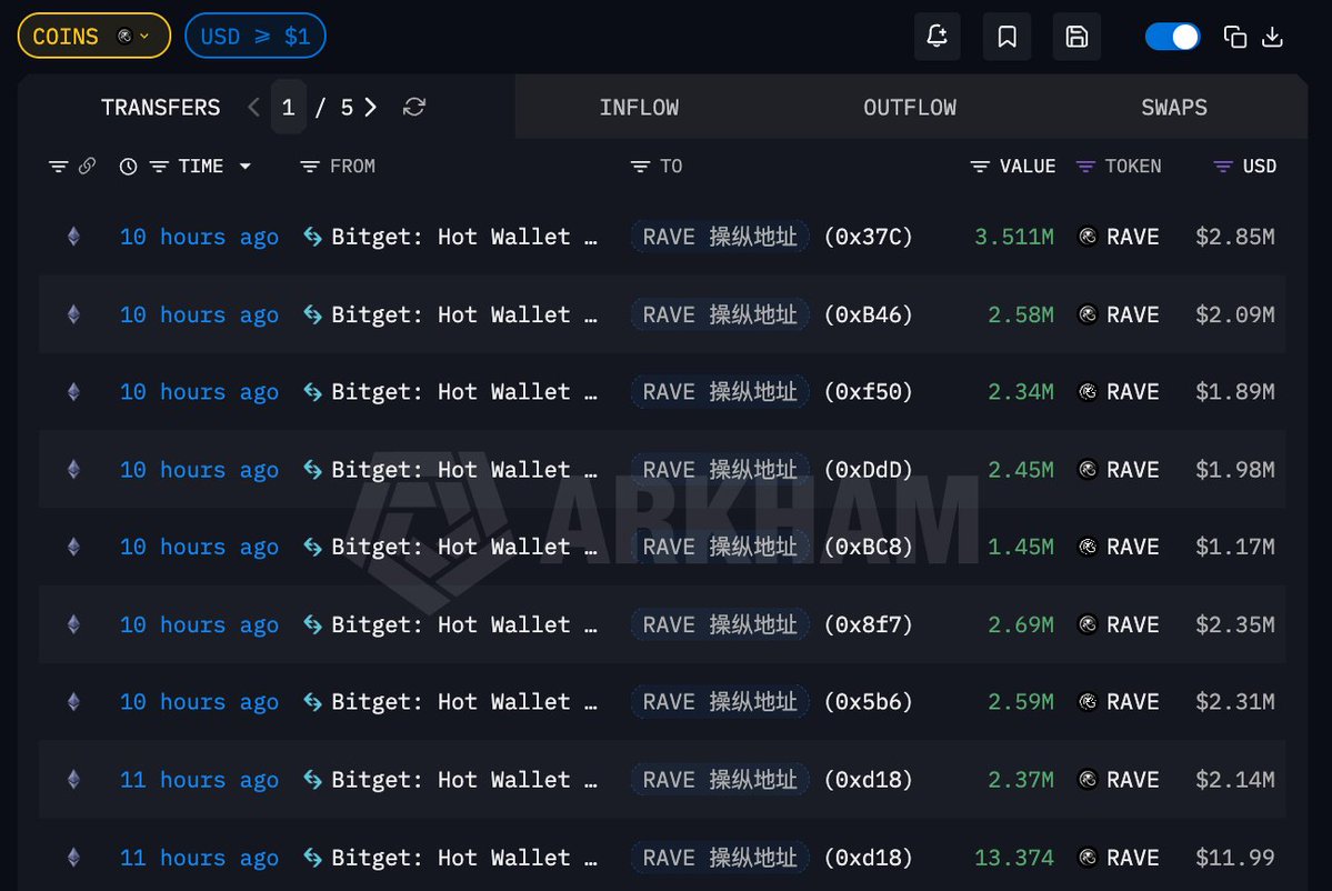RAVE 庄家胆子是真大,玩得是真野🤯 10 小时前再次从 #Bitget 提出 1998 万枚 $RAVE ,价值 1678 万美元,均价 $0.8398;这部分 RAVE 占代币总供应量的近 2%,占流通供应量的 8.1%,今早币价短时涨至 $1.11,现价 $0.9845 目前疑似操纵实体已在链上持有 7.71 亿枚 RAVE,筹码集中度达 77.2%;传送门 👉 https://t.co/iHAuQis6us #Bitget VIP 费率更低,福利更狠!买美股秒级入场