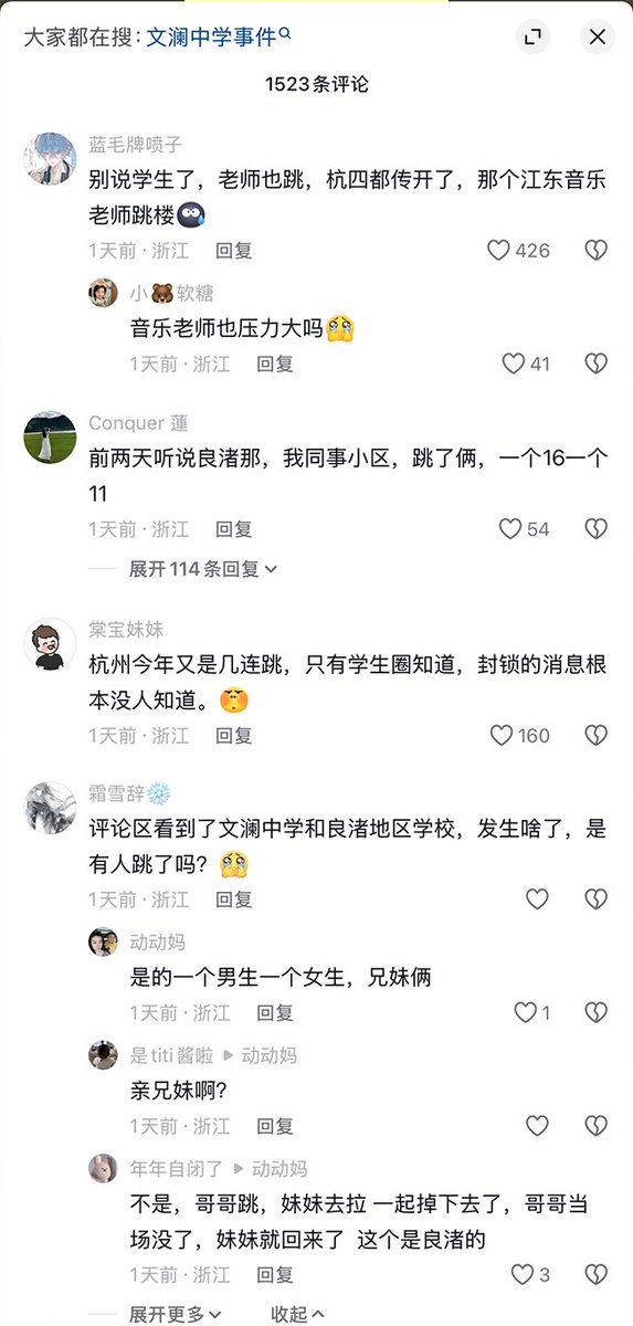 近日,有网友曝光:杭州市连日来发生多起师生跳楼事件。 4月21日,网友称:杭州拱墅区文澜中学,一名学生因压力大跳楼自杀; 网友说:“不止学生跳楼,老师也跳楼。杭州四中江东校区一名音乐老师近日跳楼” “位于良渚街道的一个小区,跳了两个孩子,一个16岁,一个11岁,是兄妹俩” “前几天余杭区开了安全会议,现在全杭州小学期中不考试,小学生都被逼成啥样了”