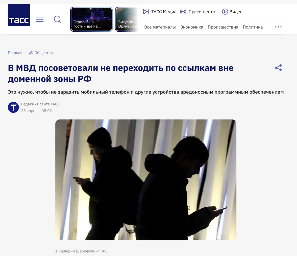 4月25日,俄罗斯新闻社报道:俄罗斯内务部建议不要点击墙外链接