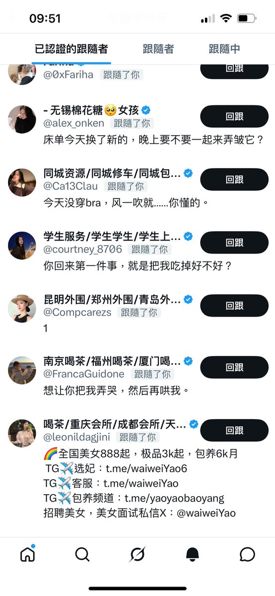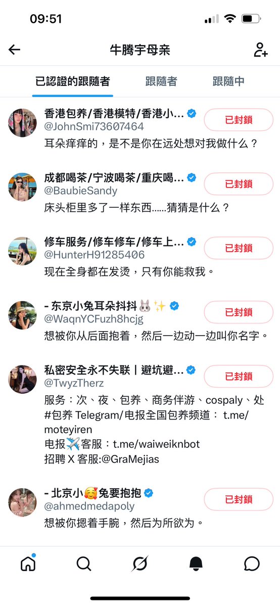 4月16日,我的X账号突然被大量带有色情和诈骗信息的机器人账号关注。这些账号普遍发布低俗内容,明显意图污染账号形象并触发平台风控。