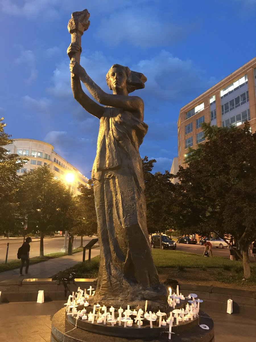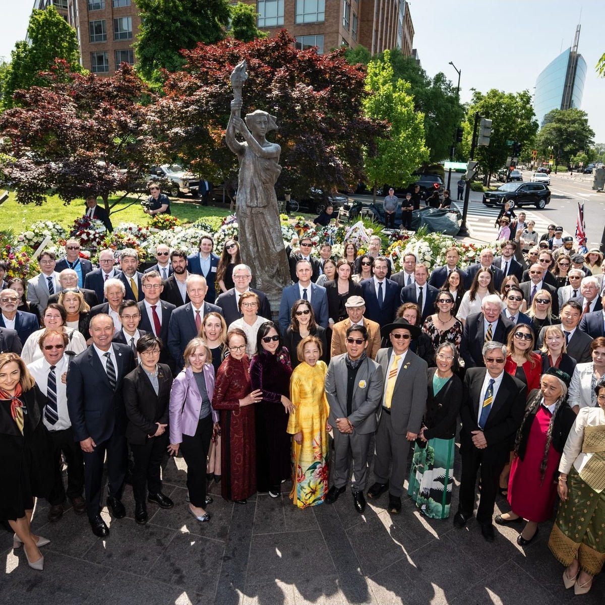 在华盛顿纪念共产主义受害者与会者的集体照,图右是在同一地点纪念六四的照片。