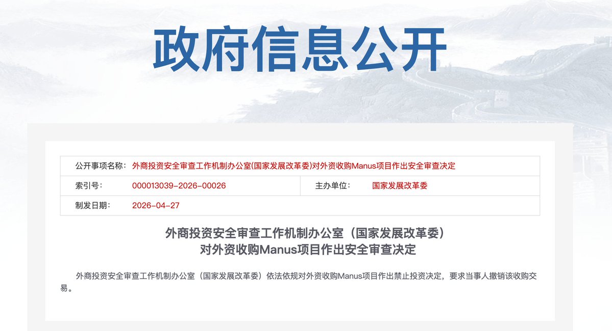 外商投资安全审查工作机制办公室(国家发展改革委)依法依规对外资收购 Manus 项目作出禁止投资决定,要求当事人撤销该收购交易。