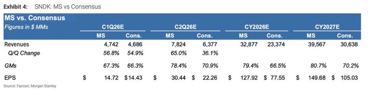 摩根斯坦利SNDK 2027年预期EPS $150,2026年$127